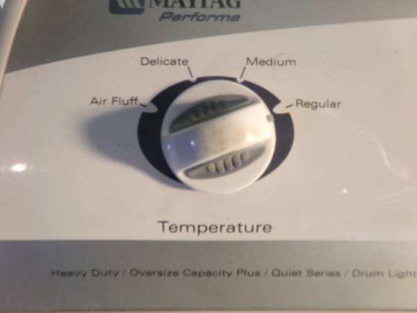Dial: Timed Dry Air Fluff Cycle: 90-80-70-60-50-40-30-Damp Dry-20-Wrinkle Release-10-Cool Down-Off