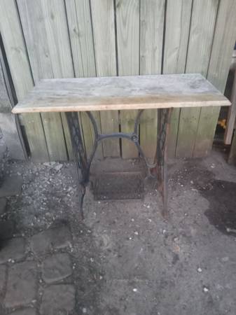 Black Cast iron Singer sewing machine stand with foot pedal. Comes with white marble top. All four wheel casters are in good condition. Has a little surface rust showing, just needs a good scuffing & a new coat of Rust-Oleum. These stands sell for twice the asking price.