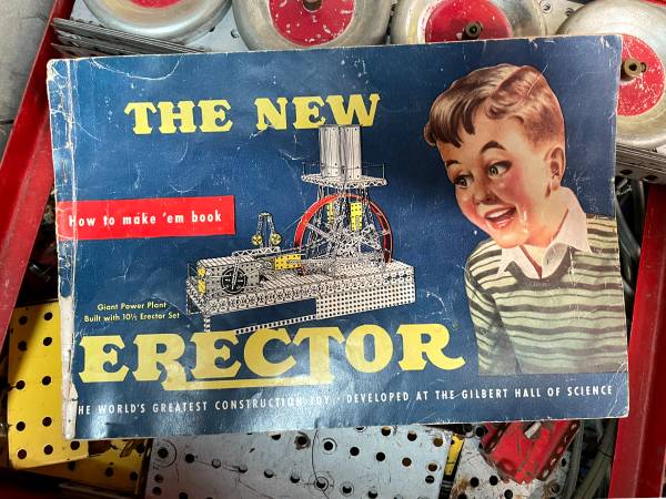 Vintage A. C. Gilbert "All-Electric" Erector Set No. 8 1/2 Circa 1954 Original metal box and How to make ‘em book. Builds a giant Ferris Wheel and Power Plant. Well loved with some rust. Untested...
