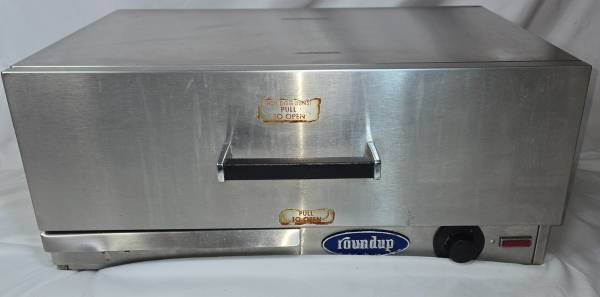 This is an AJ Antunes Roundup Food Warmer Drawer primarily for hot dogs and buns. It is a 1000 Watt unit that holds approximately 50 hot dog buns or a single full-sized steam table pan which is included. It is a stainless steel unit in good condition and working order. The steam pan has multi-colored stains which I am not sure what caused the stains. The lower drawer has build-up on the sides, probably from water. It powers on and warms up as intended. The temperature changes at the proper temperature input via the knob control. The unit has no damage or defects.