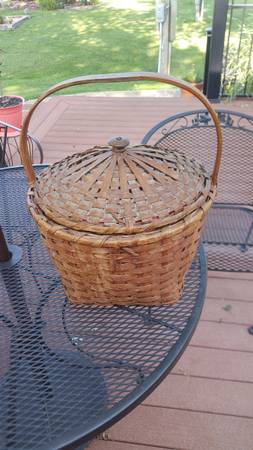 Vintage Splint Basket with domed lined lid with wooden knob and a wood handle. The basket is 18" T and has a 16" Diameter. Basket is in very good condition, with no damage of any kind.