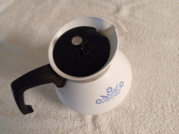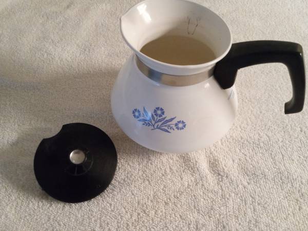This vintage Corning Ware coffee pot in the Blue Cornflower pattern is a beautiful addition to any kitchen. Made of durable glass, it can hold up to 6 cups of coffee or tea. The lid keeps your beverage warm and fresh for longer.