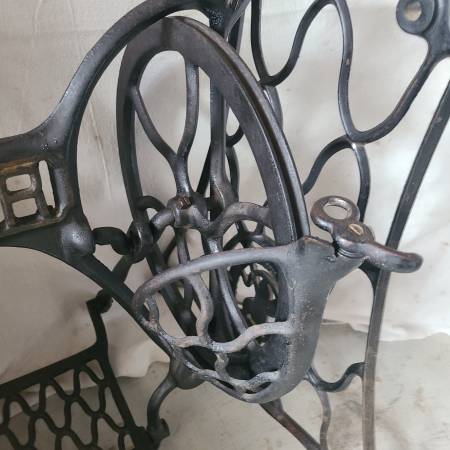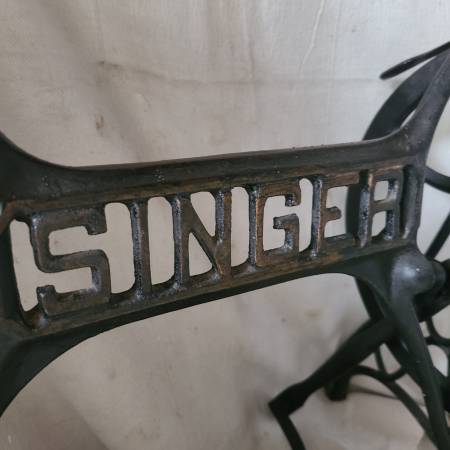 Very good condition with no rust. The original paint can be seen (including hints of gold in the three Singer logos), the treadle works smoothly, the wheels turn and it comes with the original bolts.