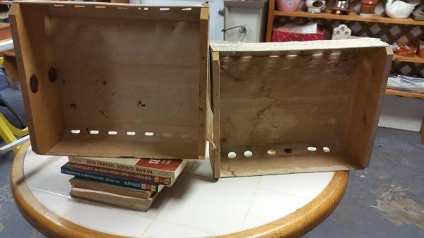 Vintage ARRA and Brothers wooden crates in good to very good condition 17 1/2"L x 14 1/4" W x 5 3/4"T. and 16" L x 14" W x 6 3/4" T. plus 2- 20"L x 12" W x 4" T. Beneath the paper are wooden slats.