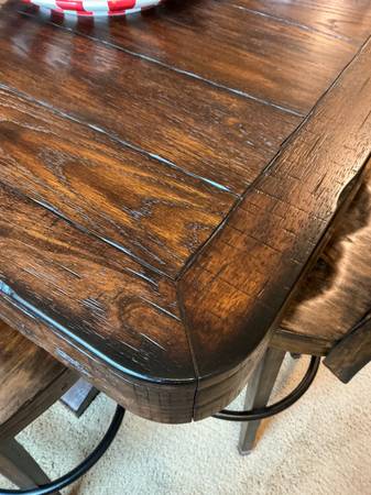Pub table with 4 chairs. The table is 42" H table is 36x36 square. Bar stools are 31" H Please call Tom at with questions.