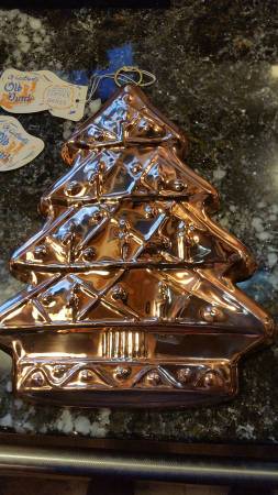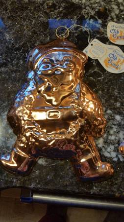 NOS Old Dutch Copper and Brass Santa (7" x 10") and Xymas Tree (9" x 11") Molds. Both are in original wrappings and in excellent condition. Buy 1 for $15.00 or both for $25.00.
