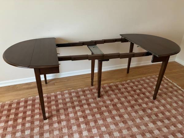Beautiful eighteenth century-style mahogany finish. Nearly perfect condition. Two leaf inserts. Includes protective pads for full-size table.