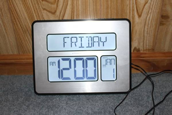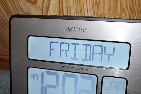 Lacrosse Technologies atomic digital wall clock. Large 2" numbers, displays atomic time and date, automatically updates for Daylight Saving time, 12/24 hour time display, perpetual calendar; date, month and full day; indoor temperature display, brushed metal finish; wall hanging or kickstand for free standing. Has a 6" electrical cord, or can be used with two AA batteries (not included). Asking $37.00 cash only please for clock. No warranty, implied or otherwise, on clock. Item sold as/is. Item was bought for my elderly mother so that she could see the time easily from her bed in a long term care facility. Call before 8:00 pm for information. Can be shown during daylight hours by appointment only.
