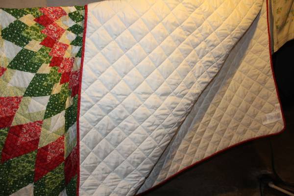 One used machine-quilted full/queen reversible bedspread in off-white with green and red pattern print. Asking $30.00 cash only please. No warranty, implied or otherwise, on bedspread. Item sold as/is. Call before 8:00 pm for information. Can be shown during daylight hours by appointment only. No other items noted in the background of some of the pictures are included in this sale.