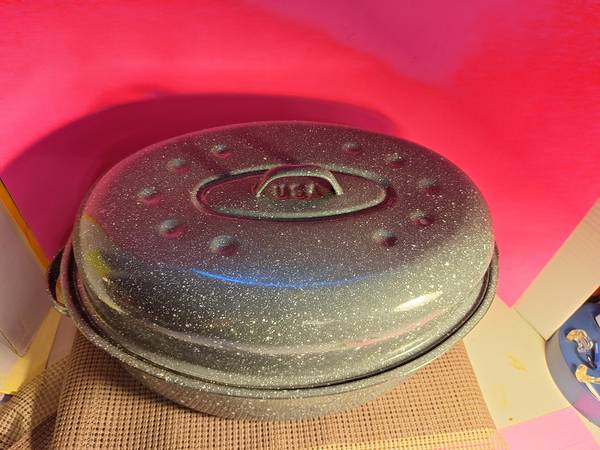 5 Vtg Black Speckled Enamel Granite Ware Large Oval Roasting Pan/Lid 16"×12"×8-$15.00