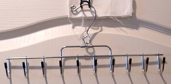 Hanging accessory hanger--multi-use. Made of durable chromed steel with snag free vinyl tips. Can be used to organize belts, purses, bags, scarves and other accessories. Saves space by easily hanging on any closet rod or wall hook. Measures 13" long. Smoke and pet free home. Please see my other posts