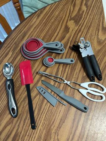 In excellent/clean condition - 7 miscellaneous much needed kitchen tools. Nothing wrong with any of them. Just starting out on your own ... I'm sure you could use these. Includes .... 4 red/gray collapsible/stackable measuring cups (1 c, 1/2 c, 1/3 cup, & 1/4 cup), 4 red/gray measuring spoons (Tbsp, 1/2 Tbsp, 1 tsp, & 1/2 tsp), can opener, red/black spatula, ice cream scoop, tongs, & knife w/sheath. Comes from a smoke-free / pet-free home. Porch pickup. Cash or Venmo. Email or text.