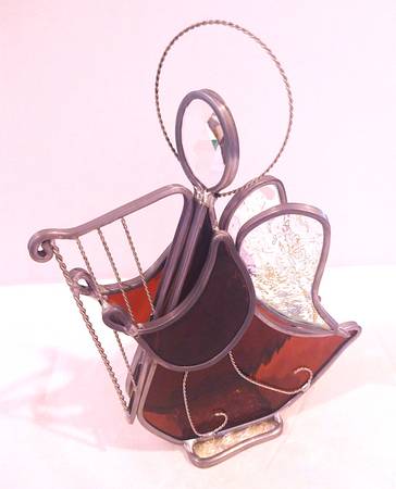 Handmade, set of 4 Stained Glass Angels. Please see all 10 photos. Makes a great gift! 2 in blue stained glass & 2 in burgundy stained glass. Photos don't do justice to the beautiful colors. All 4 angels have beveled, crystal heads. Wings & stands made out of iridescent stained glass. Blue angel with guitar is 9" H x 7.5" W, burgundy angel with flute is 7" H x 7" W, burgundy angel with harp is 8.5" H x 7" W, blue angel with horn is 9" H x 11.5" W. Smoke & pet free home. Please see my other posts