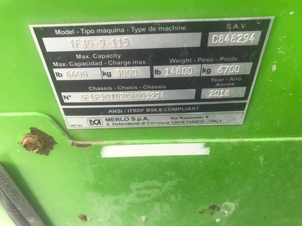 2018 Merlo TF30.9-115 4x4x4 Telehandler, 115 Hp, 2,043 Hrs Showing, Deutz 4-Cyl Turbo Diesel Engine, Hydrostatic Transmission W/left Hand Reverser, 6,600 Lbs Lift, 28’ Reach, Joystick, Battery Shut Off, Front Hyd Connector, 14,800 Lbs Total Weight, LED Lights, 400/70-20 Tires, NOTE: Front Head Light Is Broken, Door Has Been Replaced With A Homemade Door, This is similar in size to a Genie GTH 5519 or a JLG 518 and a little larger than a JCB 550 Can deliver anywhere.