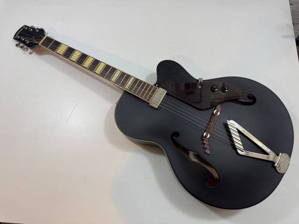 Matte black, yellowed mother of pearl neck inserts. A real looker. Great condition, truly a unique sound -- deep, resonant, classic archtop tone, easy playability. Laminated maple body, single-cutaway design, smooth mahogany neck with rosewood fingerboard, with a Gretsch-designed pickup for rich amplified sound. Perfect for jazz, blues, or rockabilly players -- or jam some Rancid.
