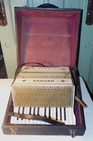 This small Vintage Hohner Brand Vintage German made Accordion is looking for a new home. Seems that every key and button on it plays and works as it should. Key Board on one side and buttons on the other. Shoulder or holding straps are included. Often used for a verity of music types such as European Fold, Pop, and rock music as well. Has 15 white keys and 10 black keys. Has 12 Buttons. ITs cash , when closed measures: 15" x 14" x 8 1/2 inches tall. I do NOT hold items. $ 175.00 cash only. Send email as to inquire. thanks Reduced to $ 150.00 on 11-5-25 Reduced to $ 130.00 on 11-12-25 Reduced to$ 90.00 on 12-21-25 Reduced to $ 75.00 on 2-6=26 be first to get it