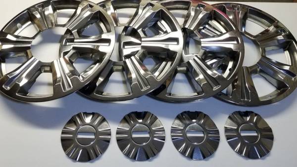 4 Sets - USED Chrome GMC 2017 Terrain 18" w/Center Cap Skins. Fits Over OEM Wheels & Hubcaps. Center Cap has Retangle Window Reveal for the GMC Logo on Original Hub Caps. Wheel Covers.